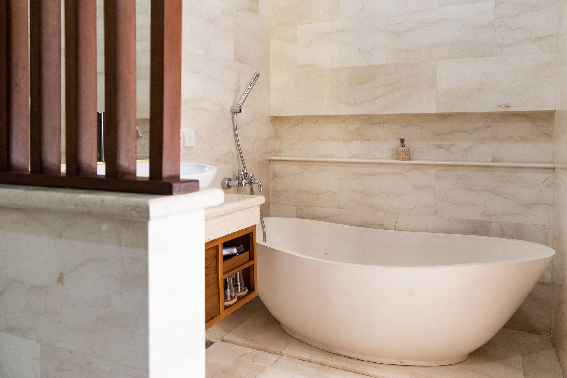 This private villa has two bedrooms, each with their own private bathroom with a bathtub. The villa also has a private swimming pool and an extra outside shower.